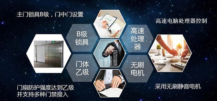 安装方式为外墙外侧、外墙内侧两种,门扇为全钢结构,外包不锈钢装饰板,采用上轨道悬挂门扇左右平移滑行,配备进口品牌平移门专用变频电机,微电脑变频控制系统及红外线安全感应装置,配备超强机械电控锁机构附带状态微感应开关,设置应急开门机构,当停电或者出现故障时,可通过开启机械锁手动开门,在特殊情况下(或停电时),可手动操作开门,具有B关A开,A关B开,两门同开(需授权)、两门同关、自检等功能。