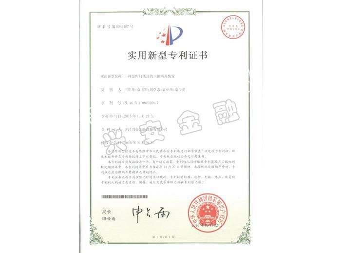 金库门锁具四锁三开装置专利证书